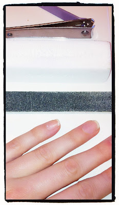 Trim nails with Clippers into a short, square shape. Using nail file, shape into a rounded-edged square, which is a clean, modern look. TIP: File in one direction to reduce splitting and damage to nails.