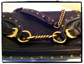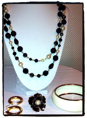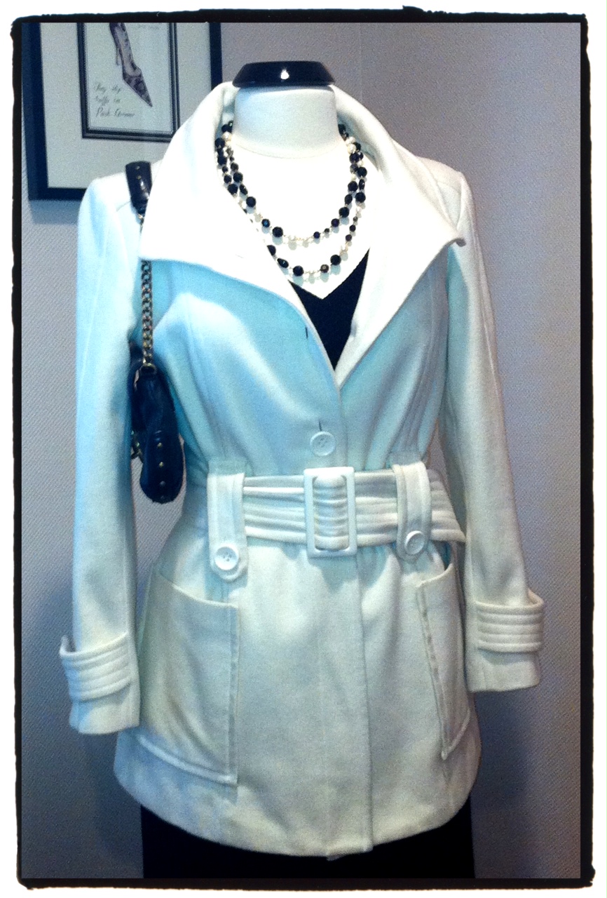 Combining classic elegance with bold, edgy accessories, this outfit features a fitted low-cut v-neck sweater (Bebe), a figure-enhancing cream-colored belted wool coat (Georgiou), a classic black wool pencil skirt (JCrew), a rocker-chic black and gold chain, studded hardware-detailed leather purse (Michael Kors), a glamorous black jet and pearl necklace (Forever 21), a bold black glass and pearl flower cocktail ring (Forever 21), contemporary cream-colored ceramic bracelet (Forever 21), traditional gold hoop earrings (Macy’s), and elegant pointed-toe black patent leather pumps featuring a white ankle strap, white miniature polka dot pattern, and white bow and scalloped details (Isabella Fiore).