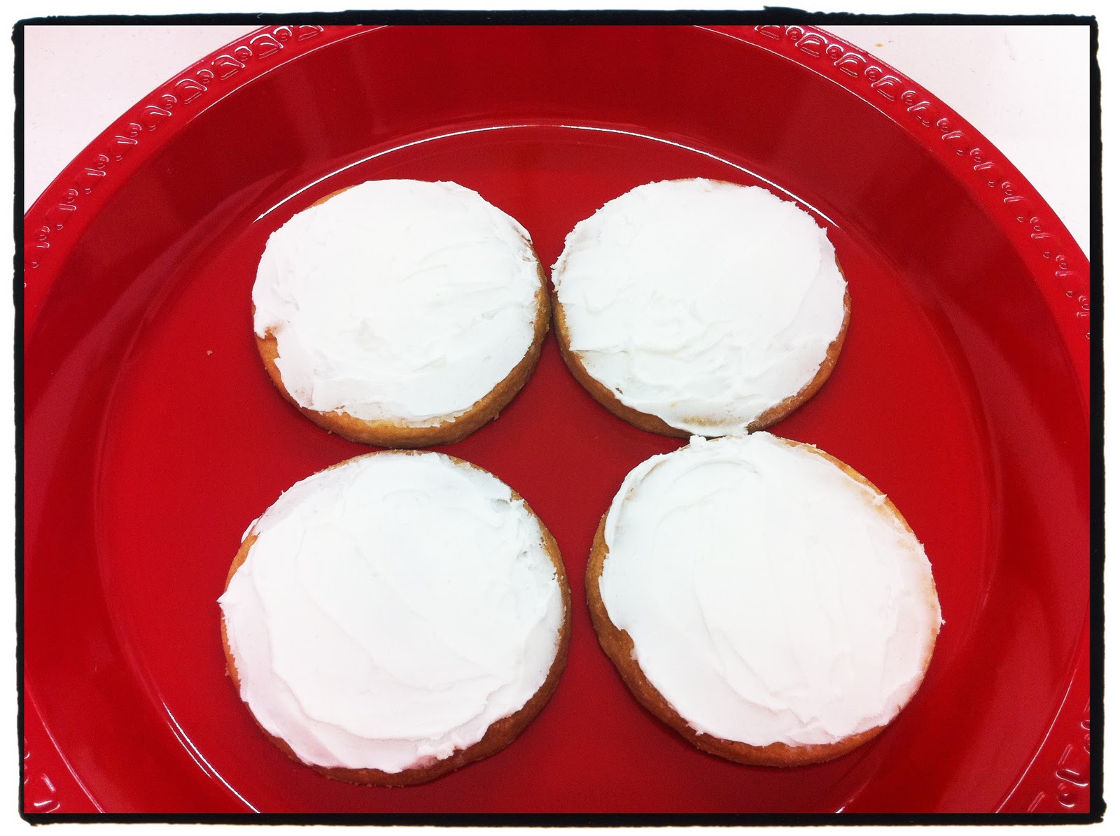 First start by using a knife or spatula to completely cover the cookies in white icing.