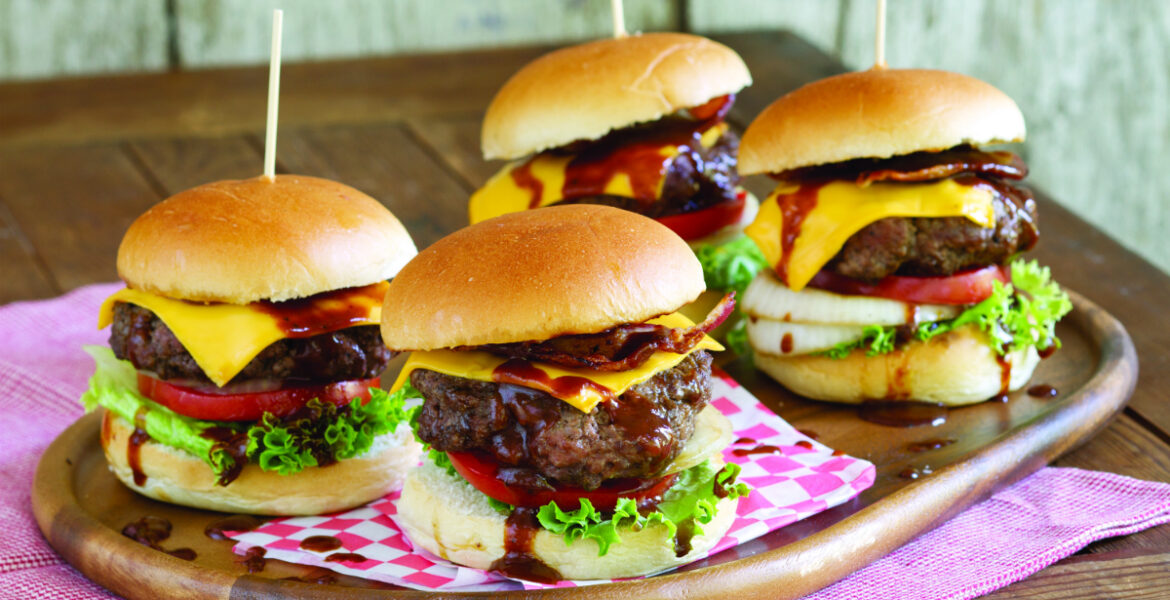 Spray grill rack with nonflammable cooking spray. Preheat grill to medium-high heat (350° to 400°). Grill burgers for about 10 minutes, turning and basting with coffee baste occasionally. Serve on hamburger buns with BBQ sauce, bacon, American cheese, lettuce, sliced tomato and grilled onions.
