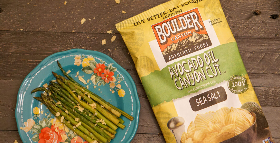 An easy, but good-for-you, side-dish that tastes great is roasted asparagus. In a pre-heated oven (set at 350ºF), bake asparagus spears (drizzled in Avocado Oil) for 20-minutes. Then sprinkle Sea Salt & Avocado Oil potato chip crumbles on top. Serve hot.