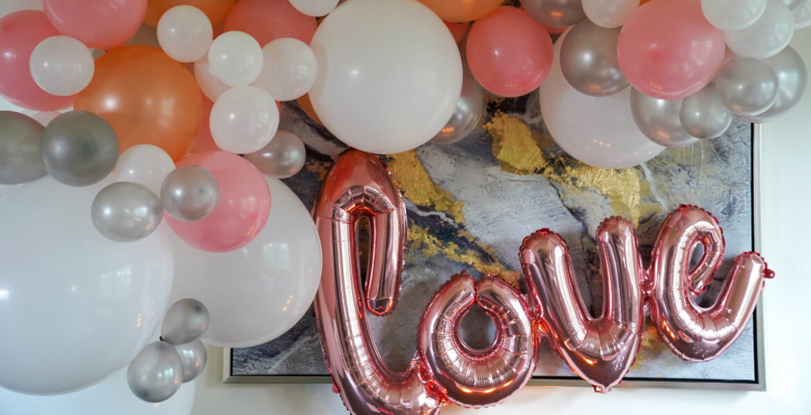 Optional: Another current trend in party balloons is the use of letter-shaped foil balloons. As shown above, a Love script foil balloon was affixed underneath the balloon garland. This created a cohesive backdrop for the Valentine’s Day celebration featured here. You can use different letter and number shaped foil balloons to create any type of message – ranging from I DO to BABY, depending on the type of party you’re hosting.