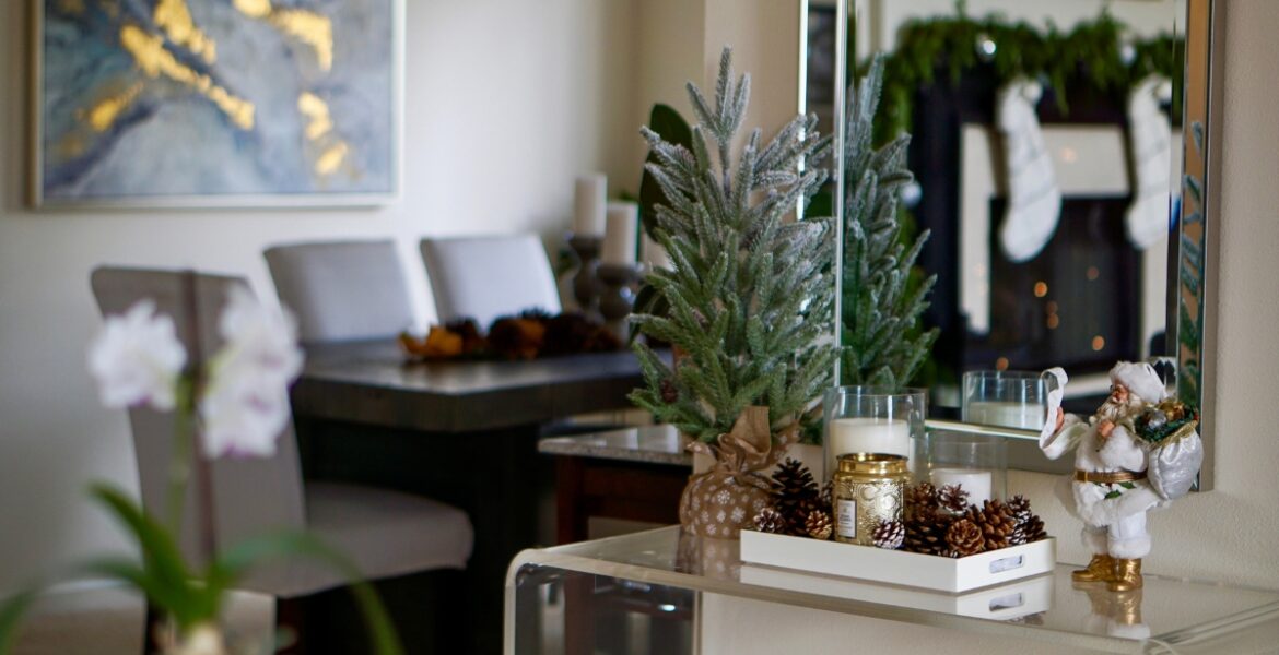 Fresh flowers are a timeless choice that adds elegance and a natural fragrance to your home. Opt for seasonal blooms like poinsettias, amaryllis, and holly to infuse your space with holiday charm. Scatter vases of flowers and natural elements (such as rustic Christmas trees, fresh garland, and other holiday elements) throughout your entertaining area for a cohesive and inviting look.